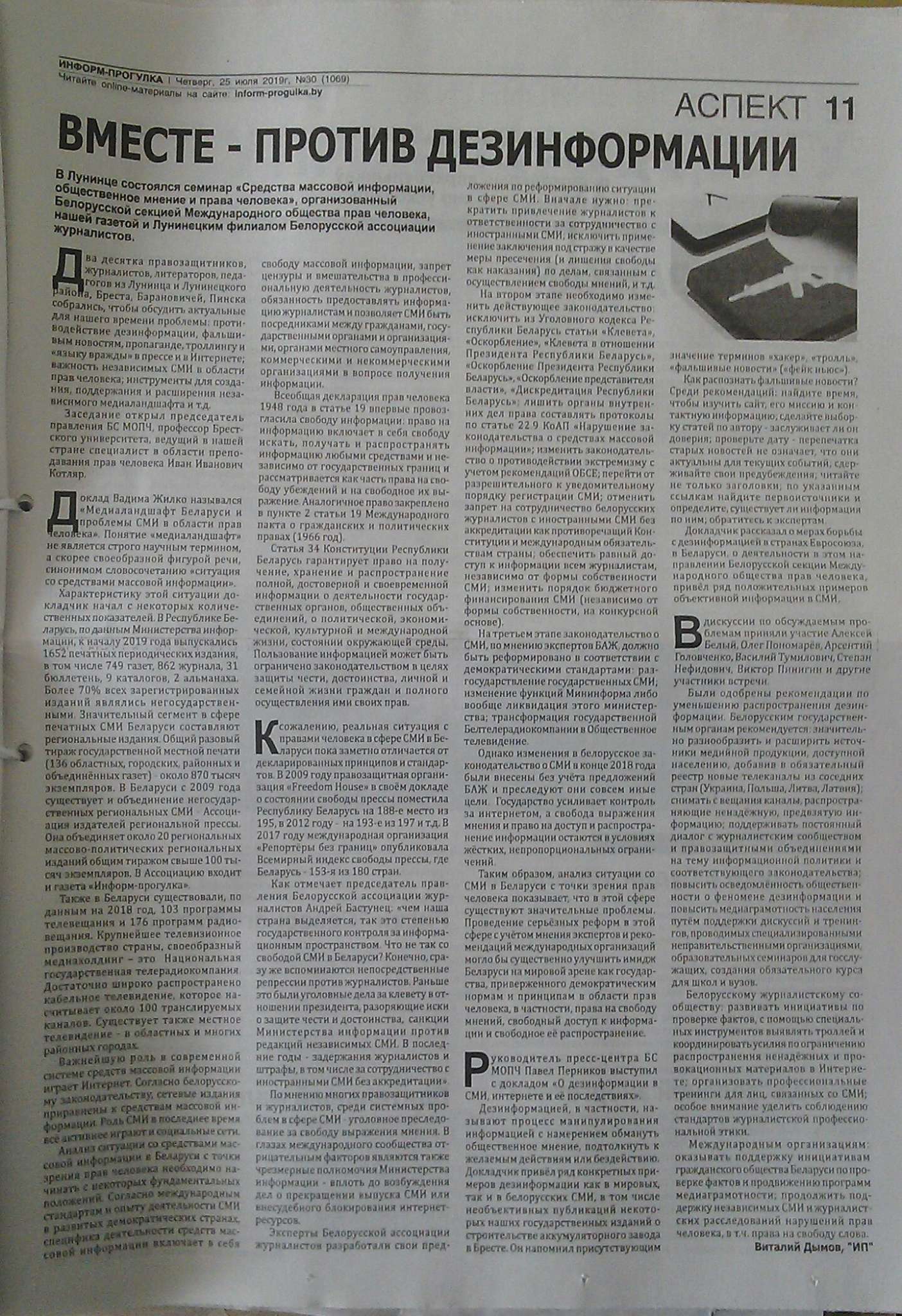 P.S. The author of the newspaper Inform-Progulka Vitaliy Dymov published his article about the seminar called «Вместе – против дезинформации» («Together against disinformation») (№30 (1069), 25 July, 2019) (see above).