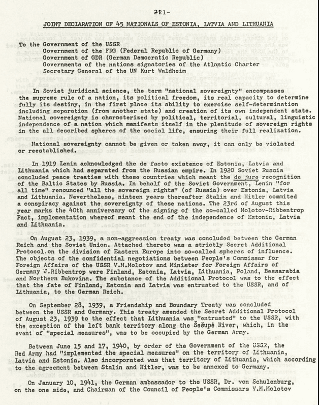 Mart-Olav Niklus was one of the signatories of the Baltic Appeal. The Baltic Appeal was a public letter to the Secretary-General of the United Nations, the Soviet Union, East and West Germany, and the signatories of the Atlantic Charter from 45 Estonian, Latvian, and Lithuanian citizens. Among other things, it called for the restoration of independence to the Baltic states, which were occupied by the Soviet Union at the time.